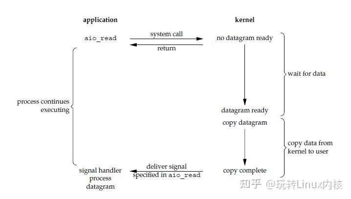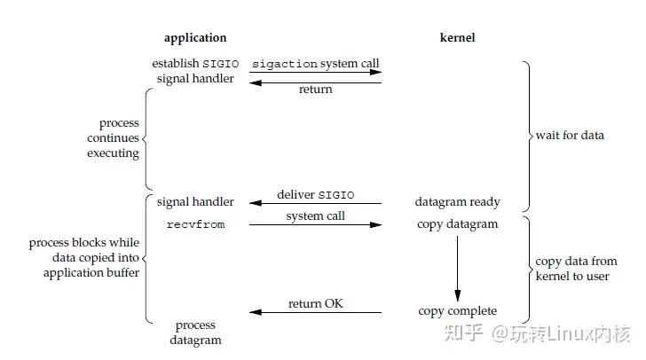 - 硬件上的 I/O 完成的时候 (数据就绪的时候), 数据就在 内核空间 里了; 这时候内核给进程发信号, 告诉进程 I/O 完成了, 进程还需要调用一次 syscall 来把数据搬到 用户空间 里