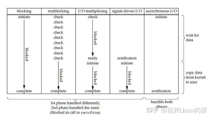 - 前四种 I/O 模型都是 同步 I/O: 都有 blocked 的时候, 这个阻塞是 数据从 内核空间 搬到 用户空间 导致的