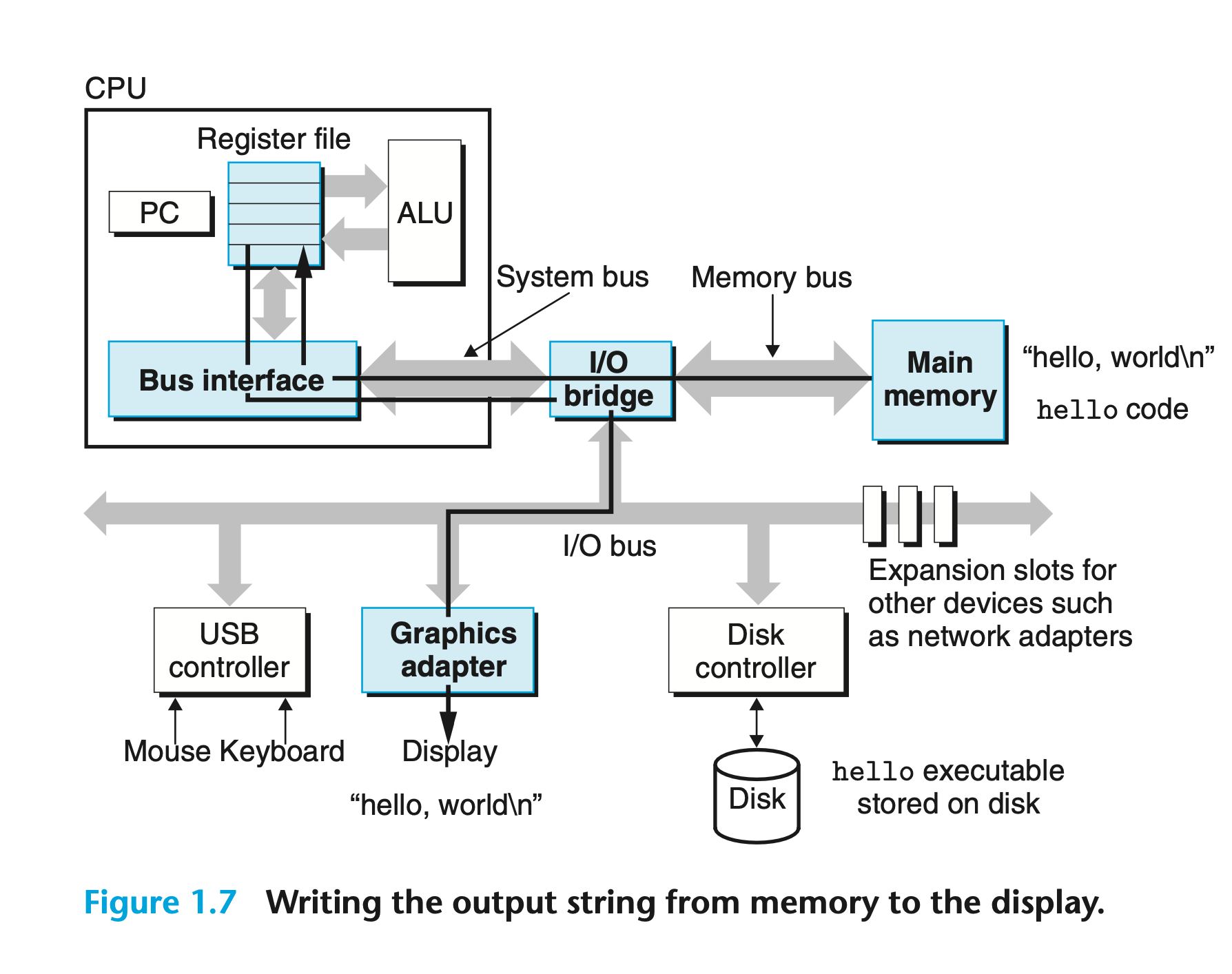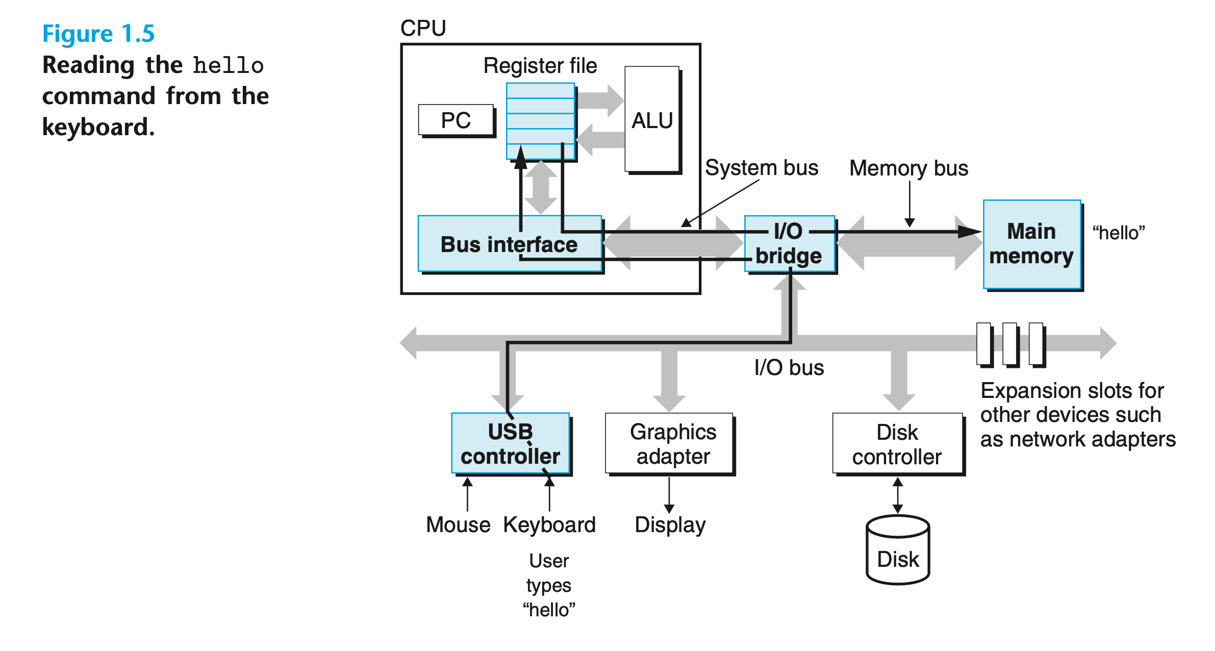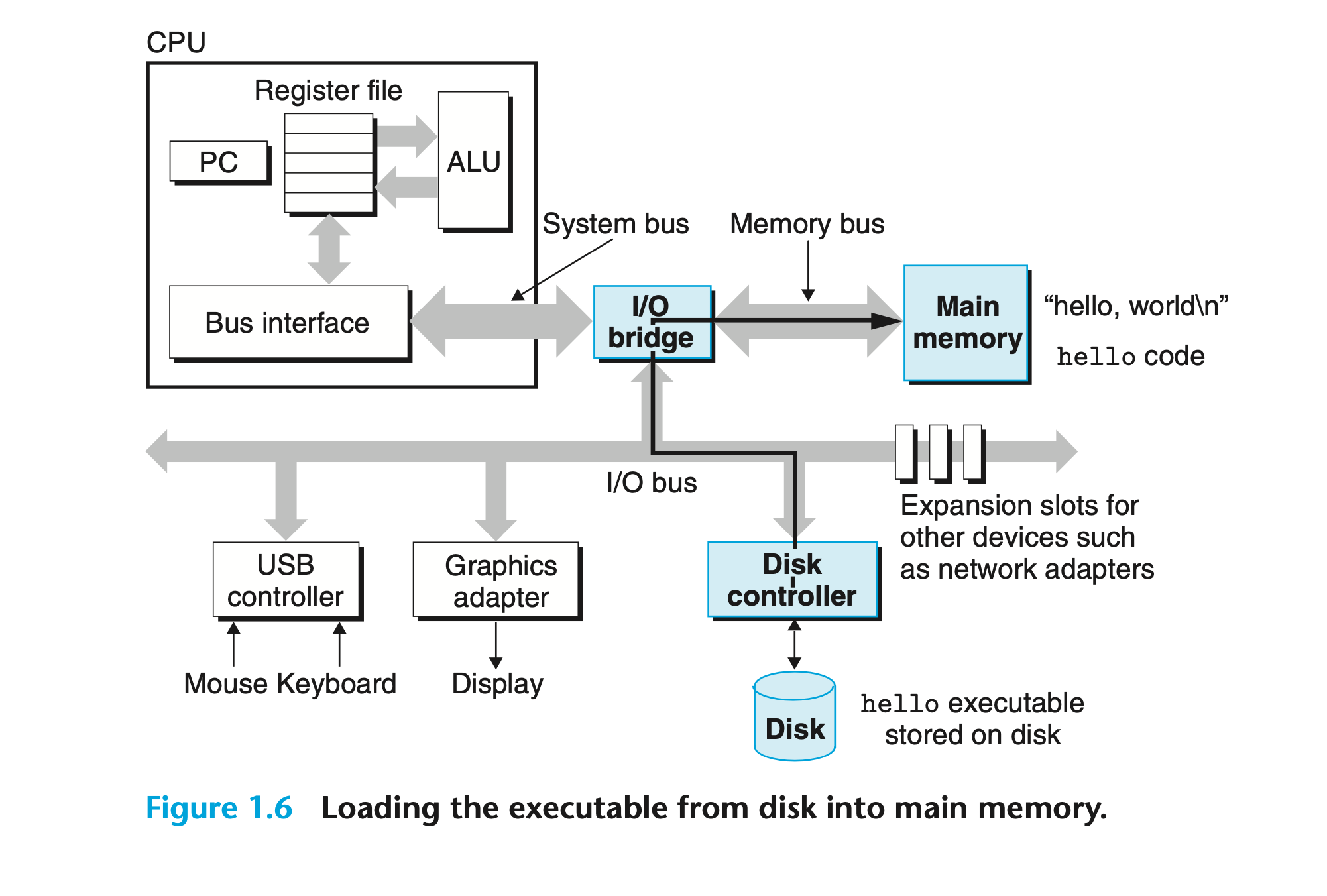 - 然后通过 DMA, 已经编译好的可执行文件 hello (原本存储在 disk 上) 会被搬到 memory 里