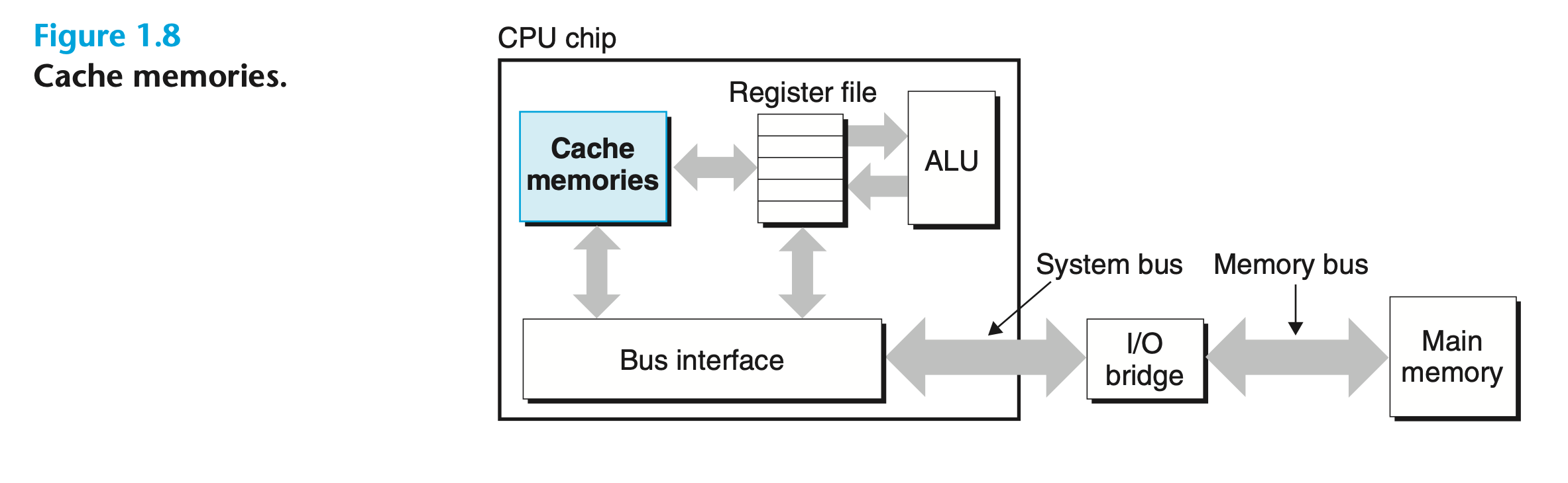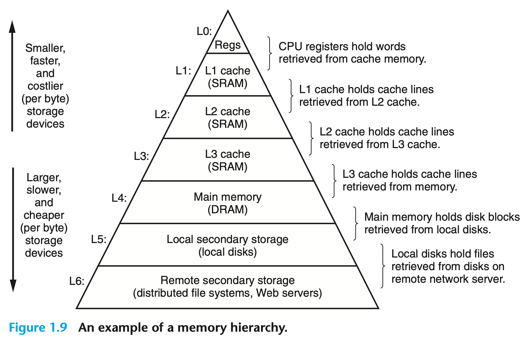“The main idea of a memory hierarchy is that storage at one level serves as a cache for storage at the next lower level. Thus, the register file is a cache for the L1 cache. Caches L1 and L2 are caches for L2 and L3, respectively. The L3 cache is a cache for the main memory, which is a cache for the disk. On some networked systems with distributed file systems, the local disk serves as a cache for data stored on the disks of other systems.” → CSAPP