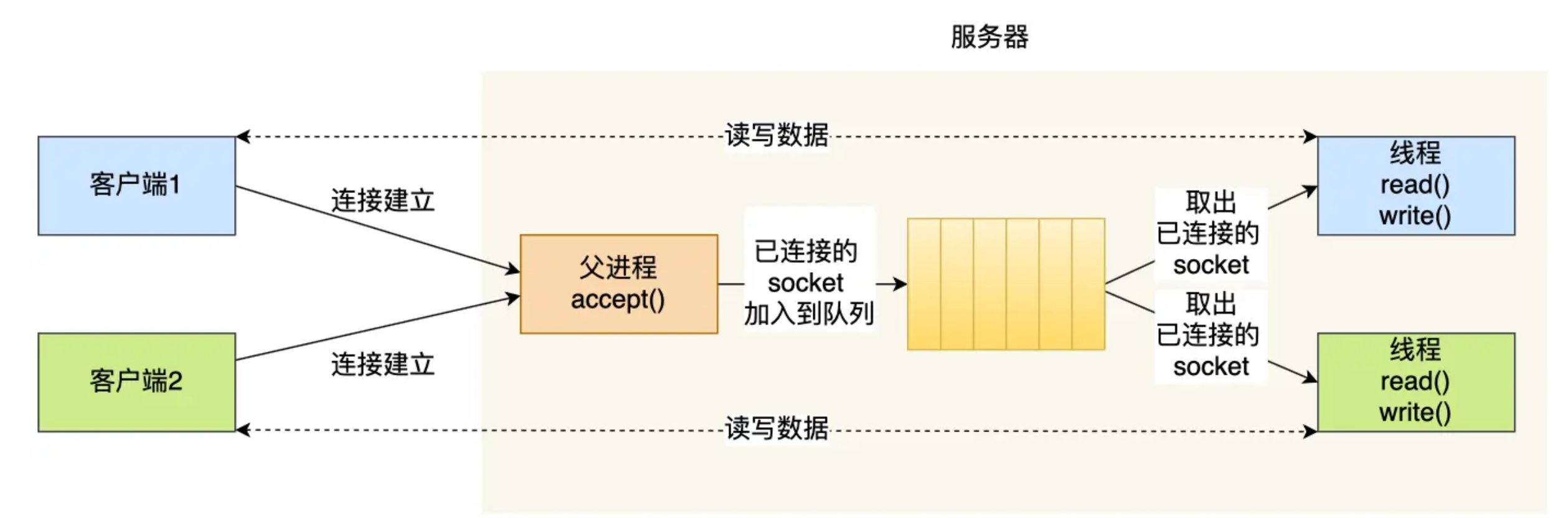 - 连接建立之后, 主进程 fork() 创建子进程, 把 socket 的文件描述符给复制到子进程里