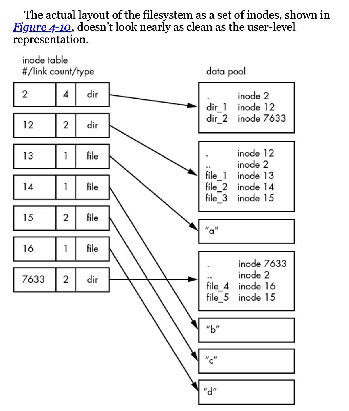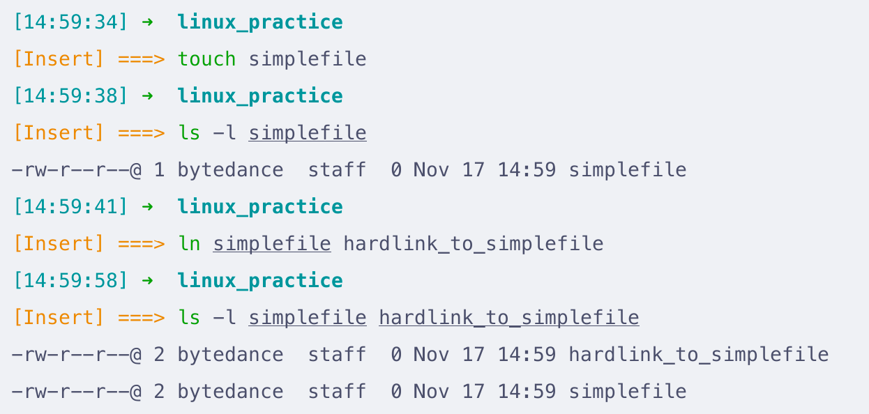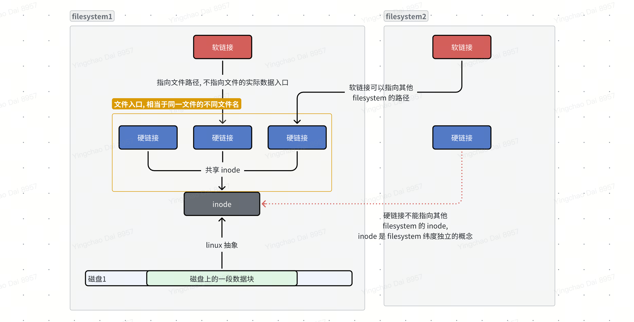 - 文件和 inode 是一对多的关系; 硬链接: 多个文件可以指向一个 inode