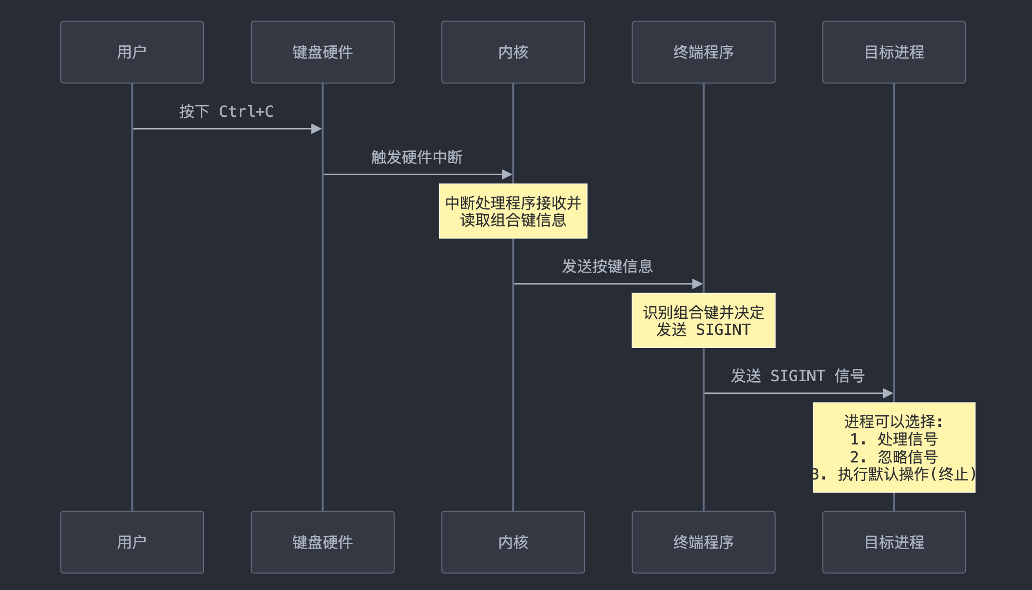 - 由终端程序识别这个组合键, 并决定发送一个 sigint 信号 (signal interrupt) 给进程