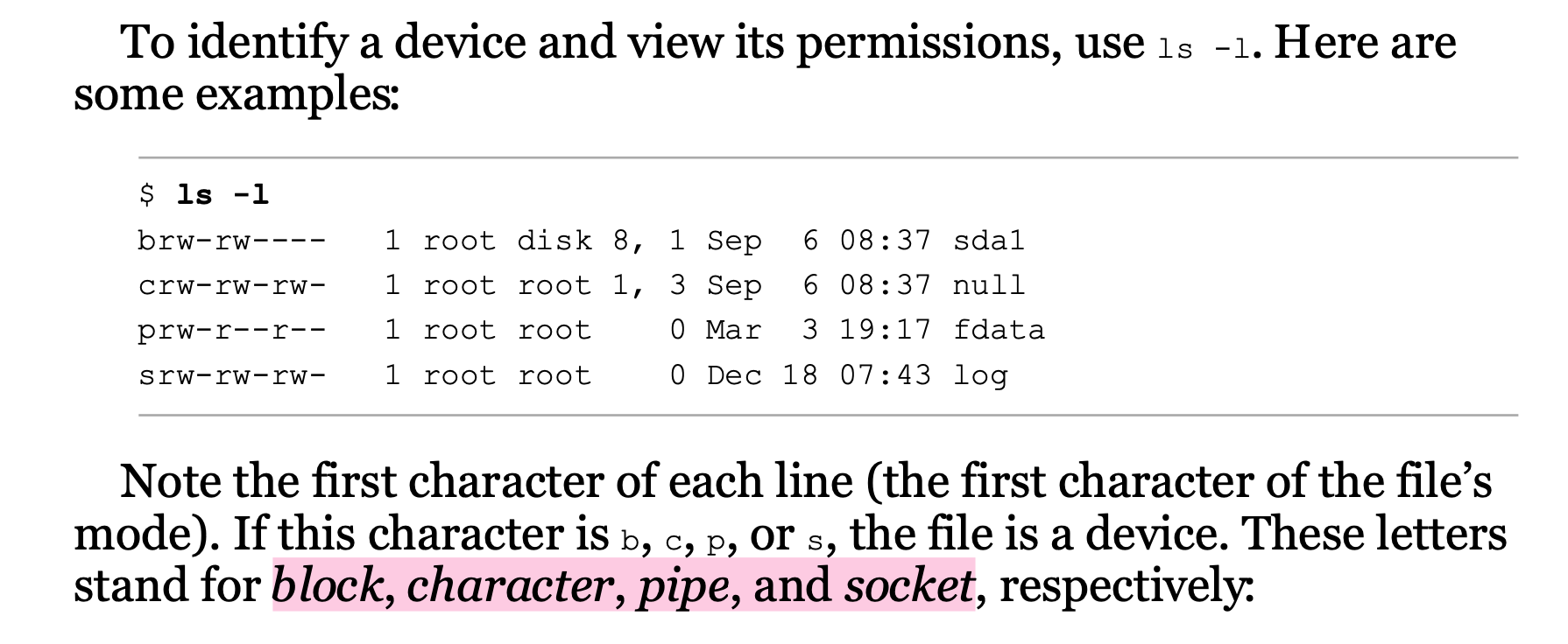 - how linux works 里有讲但先不学 block 和 character 是啥; 这里是想指出 pipe 和 socket 属于