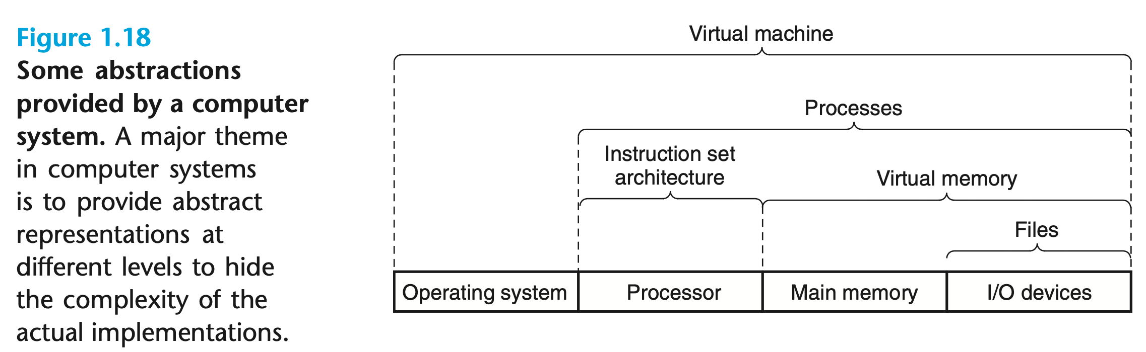 “The operating system kernel serves as an intermediary between the applica- tion and the hardware. It provides three fundamental abstractions: (1) Files are abstractions for I/O devices. (2) Virtual memory is an abstraction for both main memory and disks. (3) Processes are abstractions for the processor, main memory, and I/O devices.“