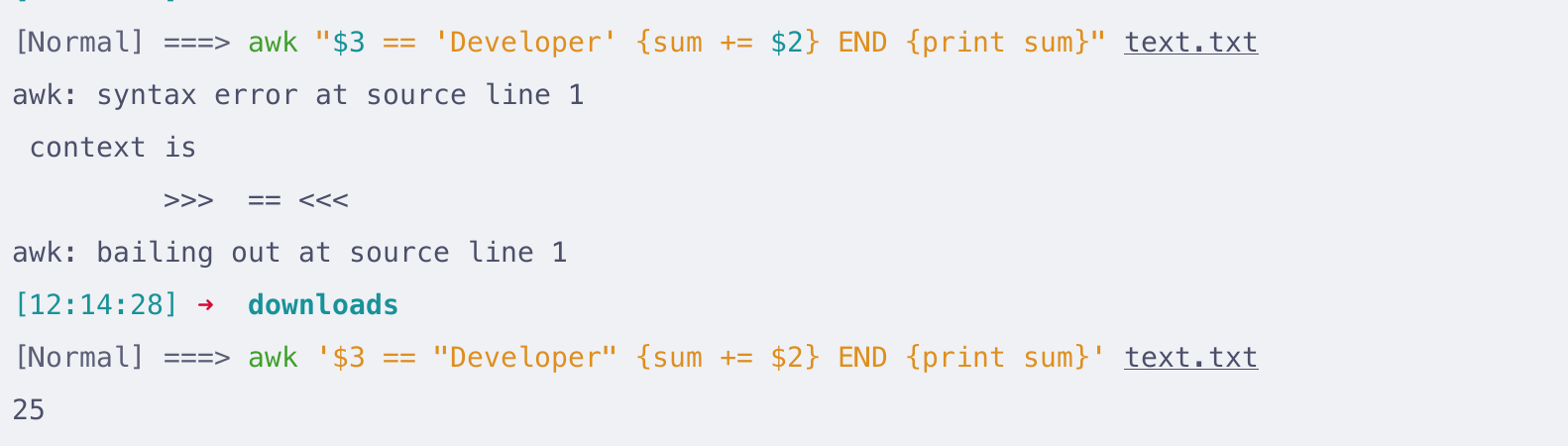 cat test.txt ; echo "\nnow running ls\n" ; ls- test.txt 不存在, 返回 cat 的 stderr