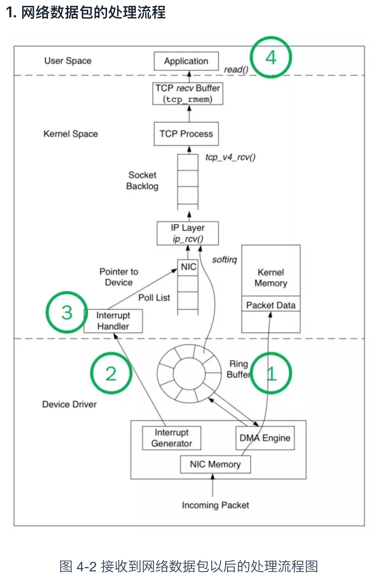 图 4-2 是网卡接收到信息后,把信息发送给用户态的进程处理的流程图。这个过程可以分为四步来理解: