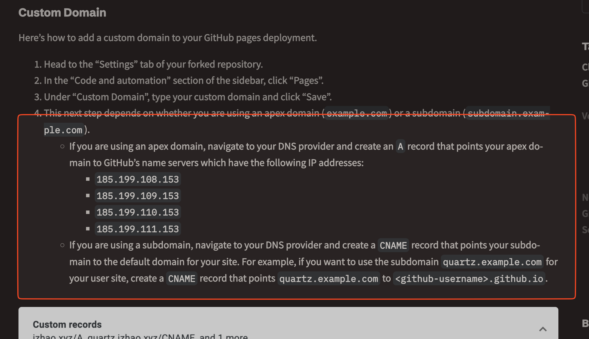 - 我用 subdomain A record 指向 github ip 的时候, 遇到的问题是, ssl 过不了; 我记得 cloudflare 的报错是 ssl 相关的, code 526: invalid ssl cert