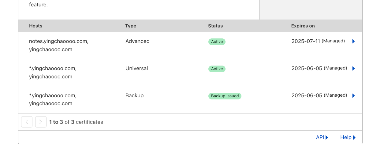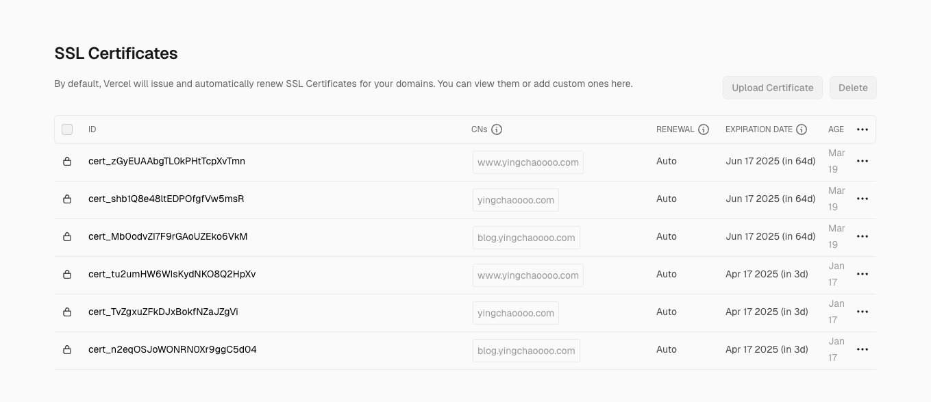 - vercel 上的 cert: 能看到每个 subdomain 都有自己的 cert