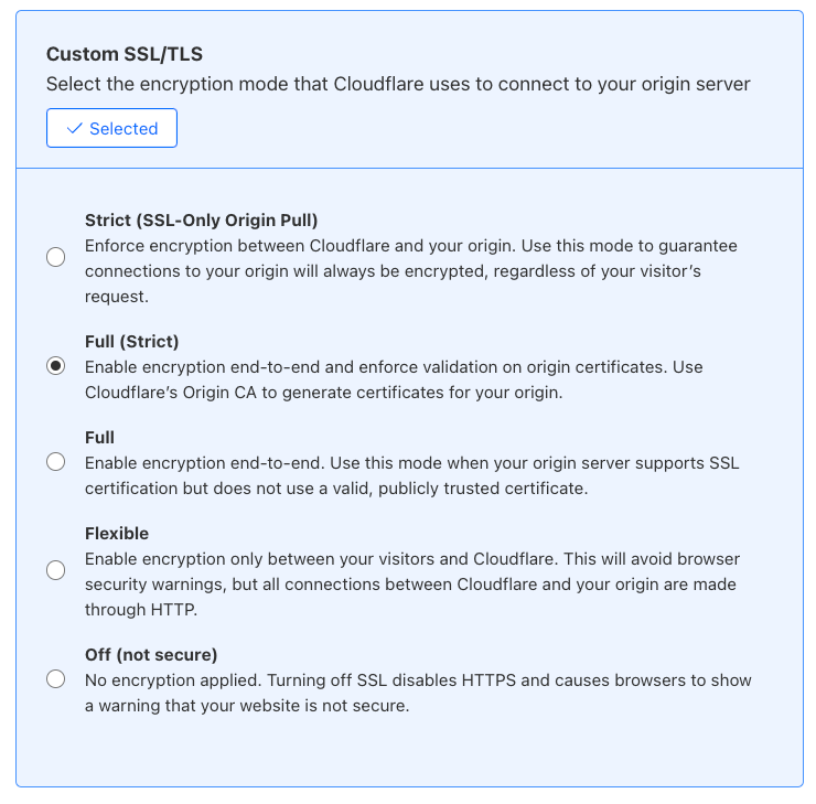 http, then Cloudflare connects to the origin using plaintext HTTP and vice versa.” - full (strict):