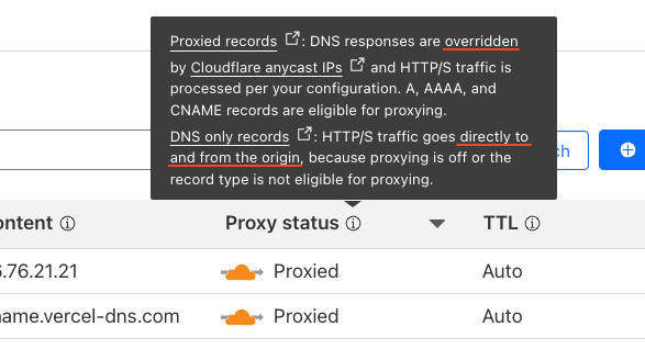 - “DNS responses are overridden by Cloudflare IPs”: 也就是说, client 都不会感知到这条 dns record (invisible to client)