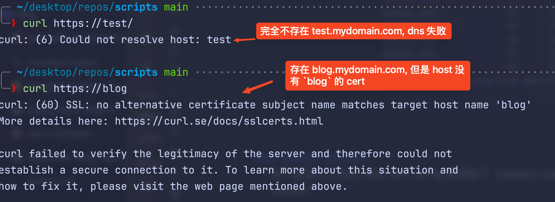 curl https://blog/: 通过 search domain, dns lookup 能够 resolve 到正确的证书, 但是 http header 的 host 还是blog, host 没有blog的证书, 只有blog.mydomain.com;
