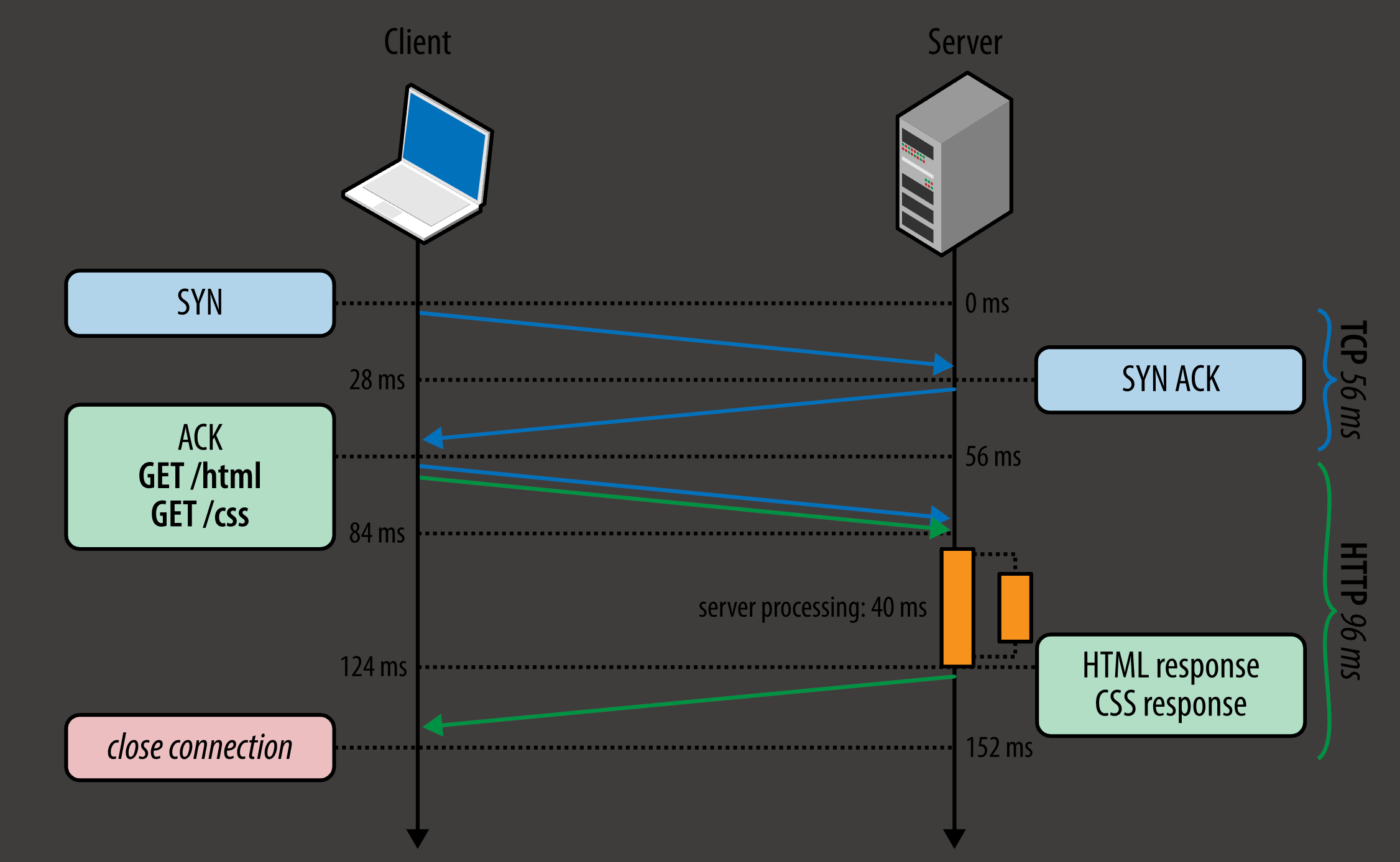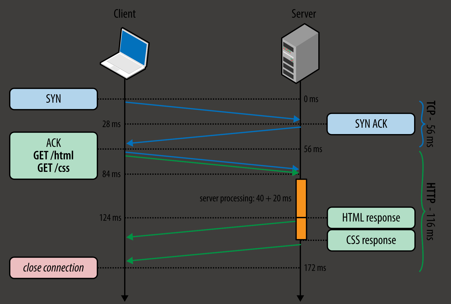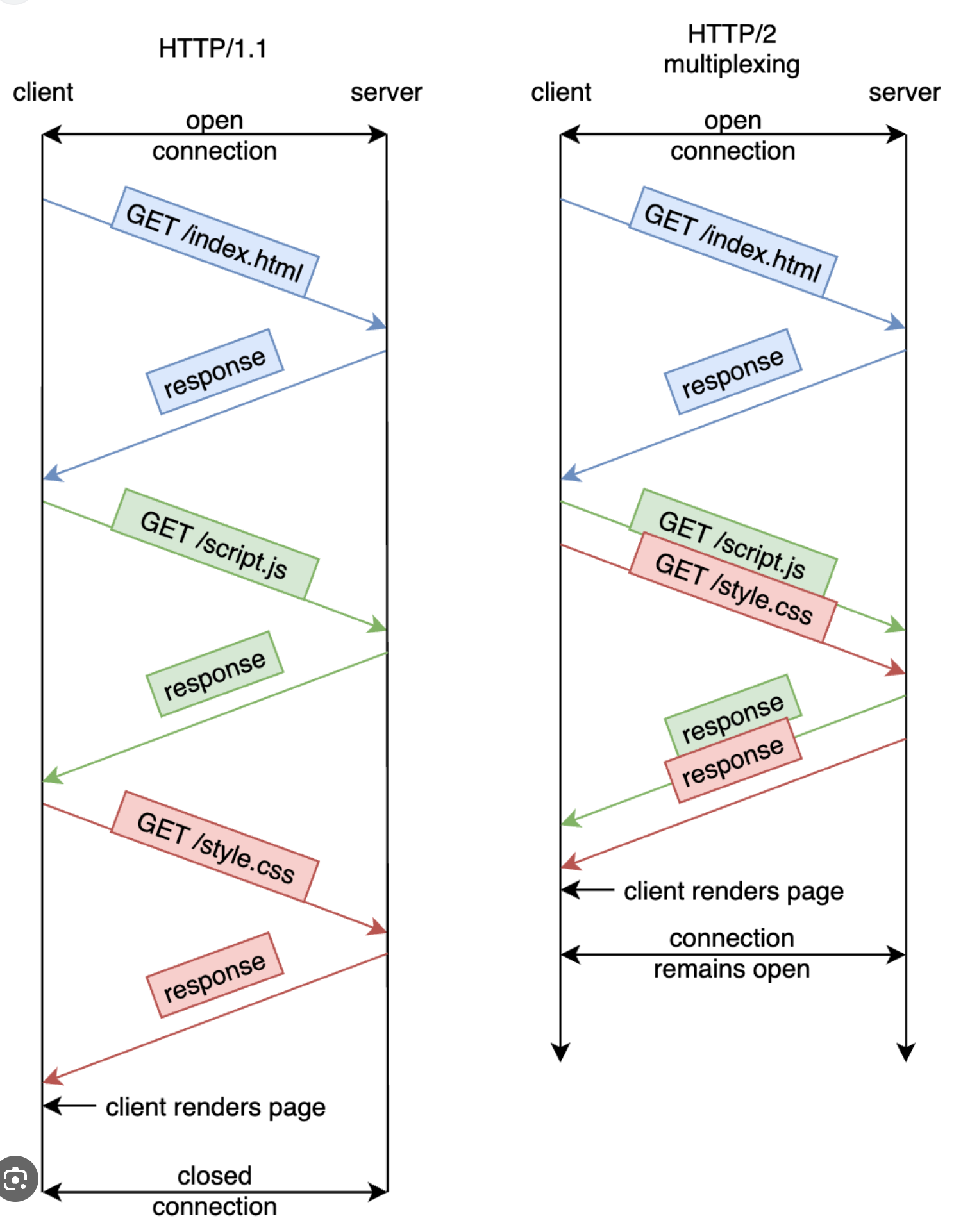 - 上面那张图中, server in parallel 地处理 html 和 css 的 请求, 先处理完了 css 的, 但也只能等到 html 的请求处理完了之后才能发送 css; 因为服务端要按照请求的顺序来返回