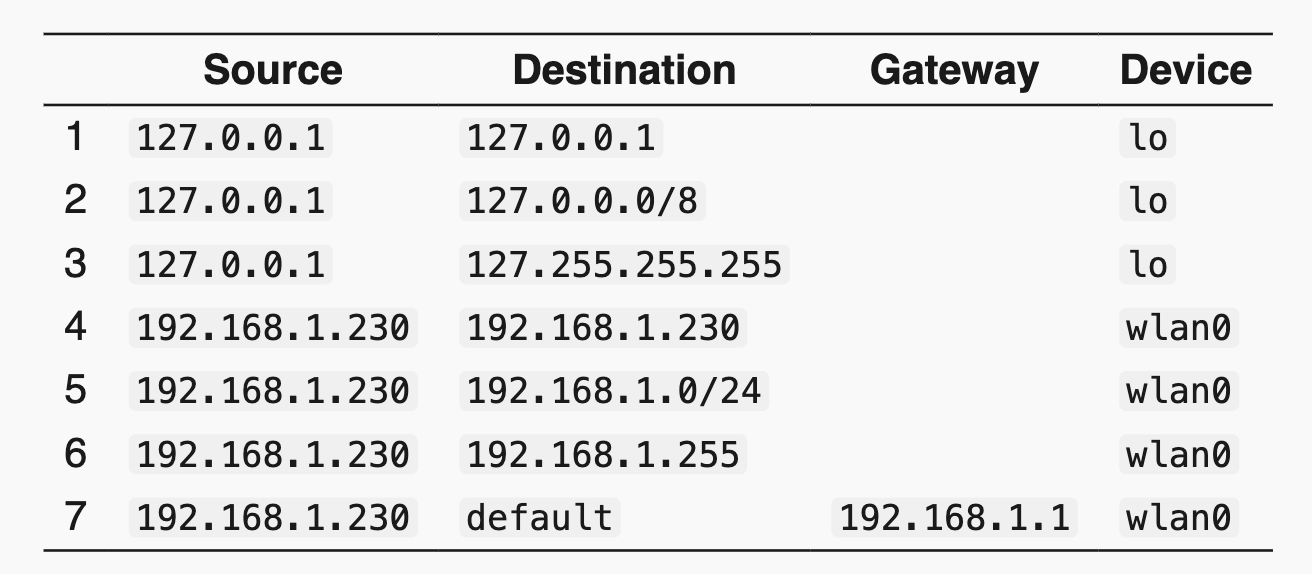 - 如果要发送的 IP packet 的 目标 IP 地址 不在 路由表 上, 就会发给 第7行 的 default, 是个 gateway, 也就是这个子网的 router