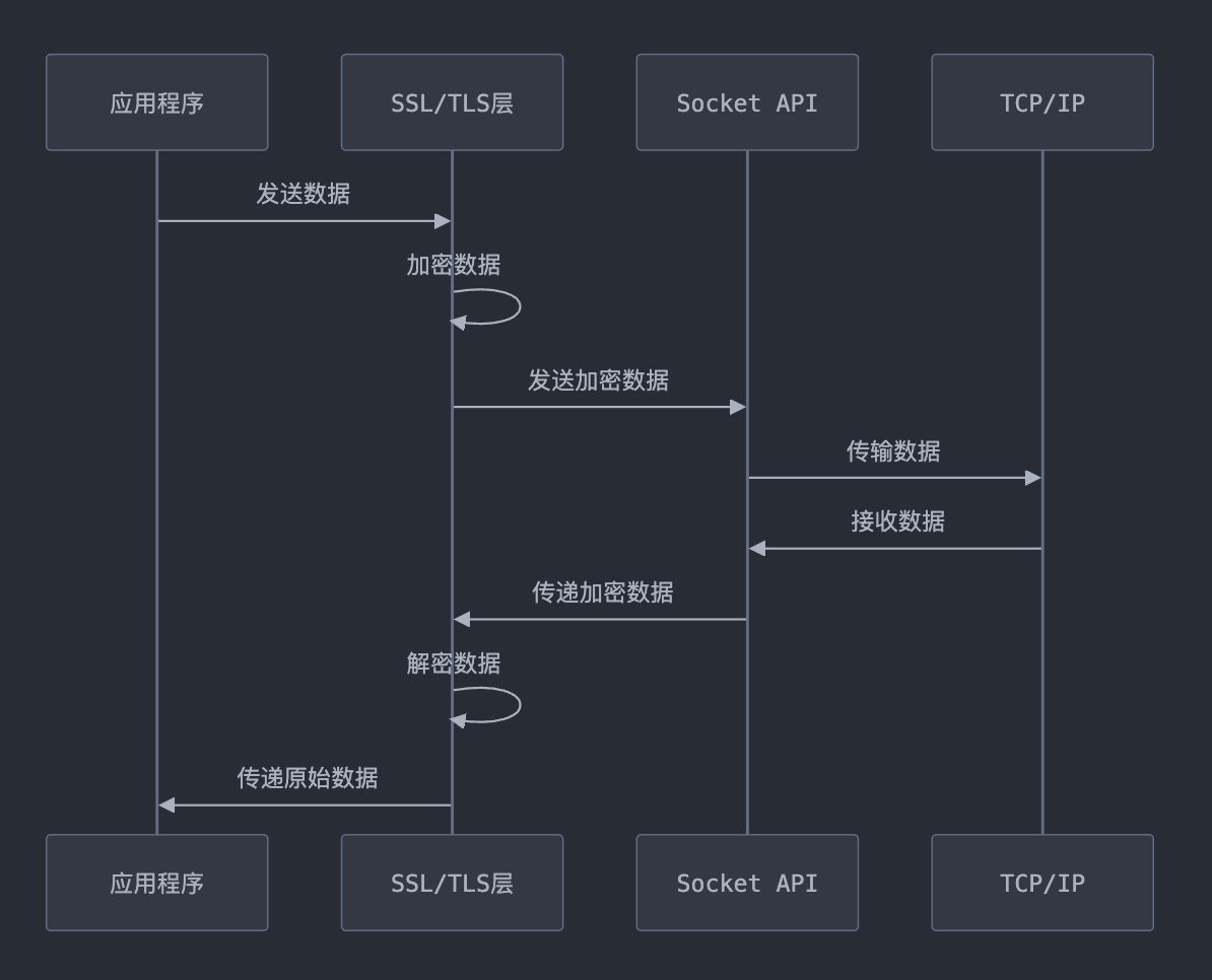 - SSL/TLS 使用 socket 来: a. 建立初始连接 b. 发送加密后的数据 c. 接收加密的数据