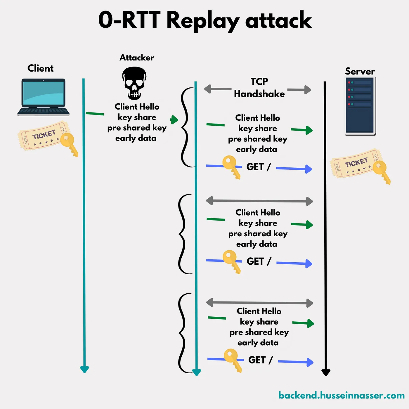 - 因为允许 0 RTT, first flight of data 就已经包含了 application data, 所以 attacker 可以直接重放这段 data, 就可以重复 client 的请求