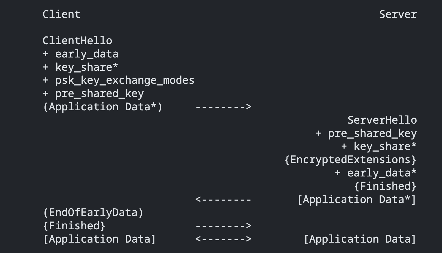 - client 会直接发一个上一次链接时使用的 pre shared key PSK (这些和链接相关的信息可以统一理解为 session ticket)