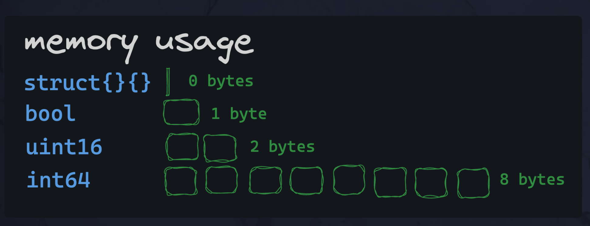 - empty struct is a struct without any fields, taking 0 byte of memory