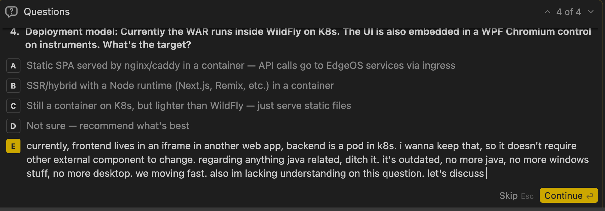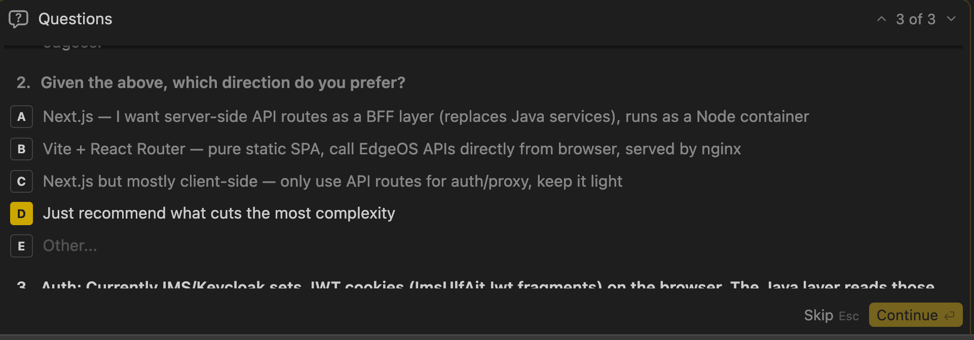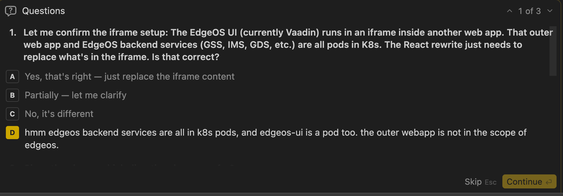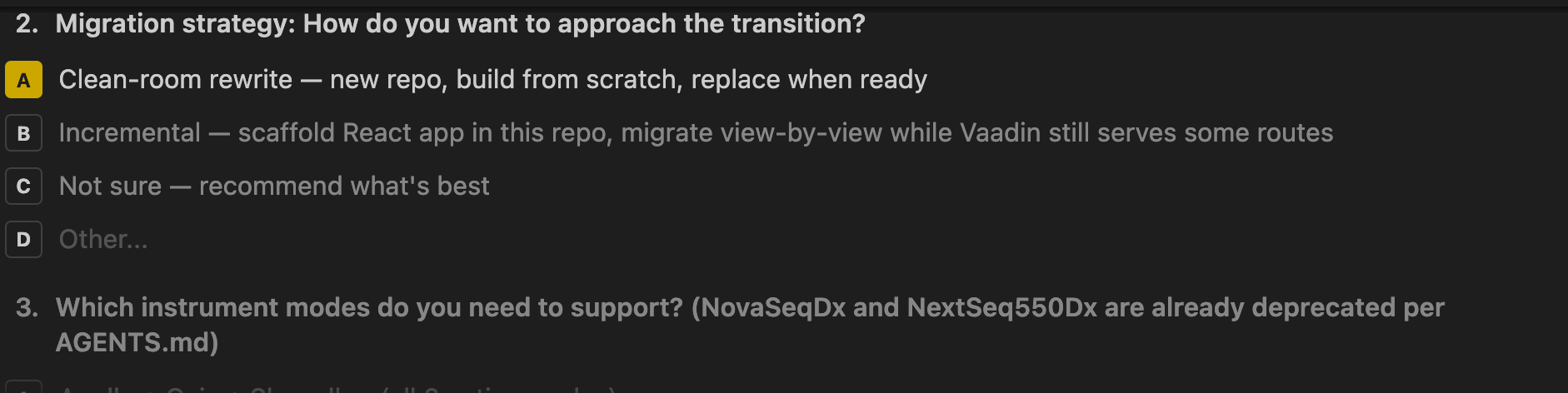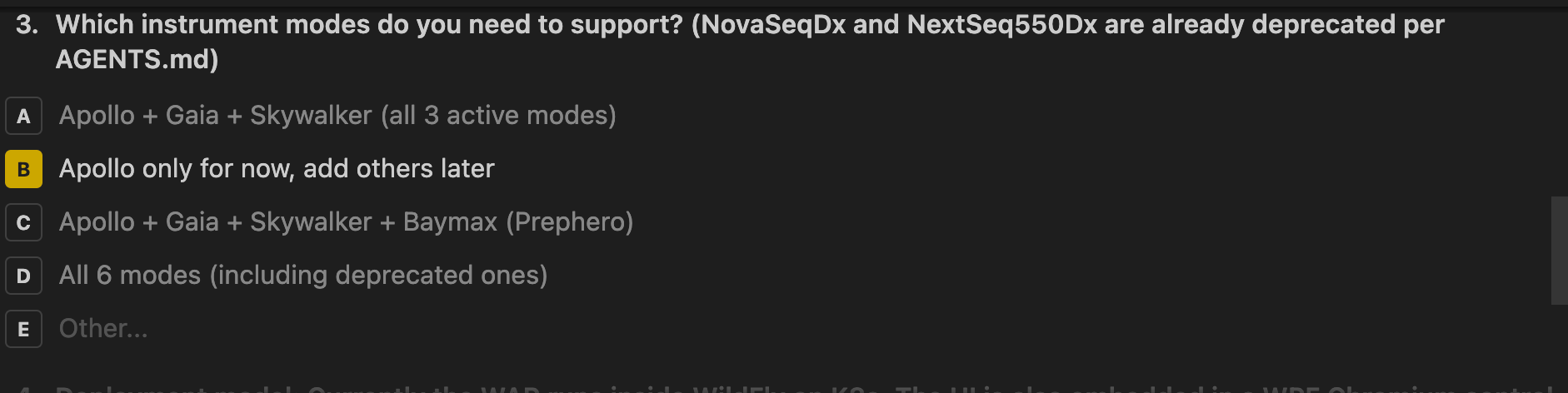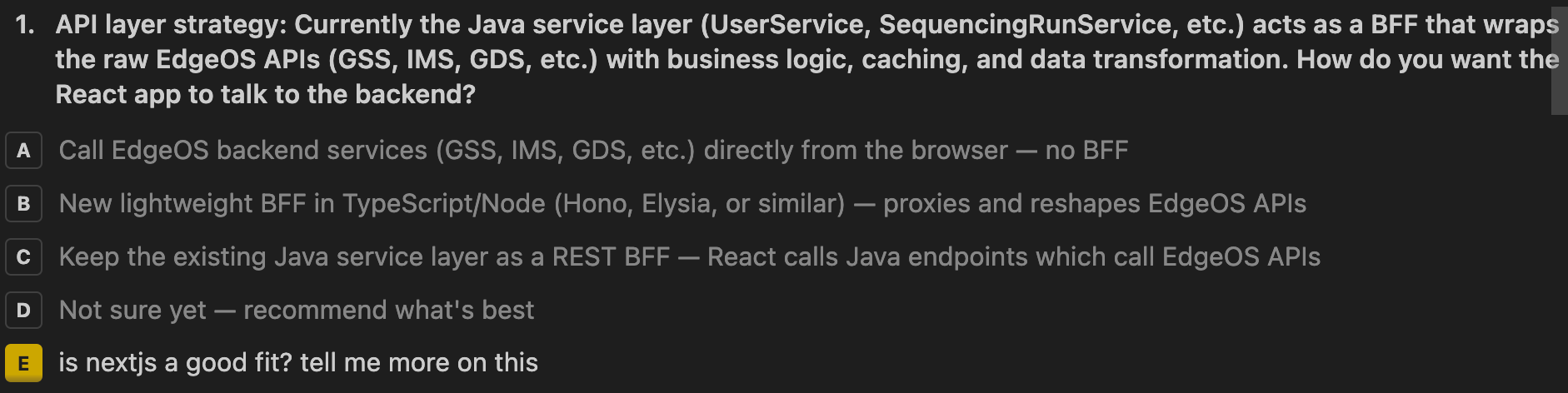 “APl layer strategy: Currently the Java service layer (UserService, SequencingRunService, etc.) acts as a BFF that wraps the raw EdgeOS APIs (GSS, IMS, GDS, etc.) with business logic, caching, and data transformation. How do you want the React app to talk to the backend?”